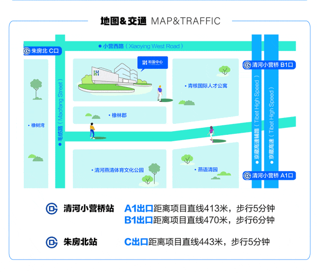 地铁昌平线清河小营桥站B1出口或朱房北站C出口